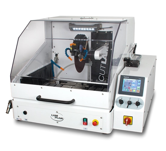 CUTLAM 3.1 - Automatický a programovatelný řezací stroj se 2 nebo volitelně 3 motorizovanými osami, vybavený řezacím kotoučem o průměru 300 mm.