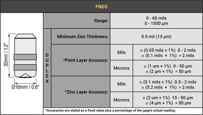 Sonda FNDS je tedy určena pro měření duplexních povlaků na feromagnetických podkladech a pro měření neferomagnetických povlaků na feromagnetických podkladech a nevodivých povlaků na neferomagnetických podkladech s automatickým rozpoznáním druhu podkladu. Měřící rozsah je od 0 do 1500 µm, minimální tloušťka Zn pro duplexní měření 13 µm. Příslušenstvím sondy je sada kalibračních fólií, návod k obsluze a kalibrační certifikát.