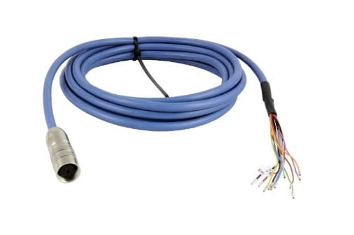 12-ti žilový kabel využijete pro napájení, všechny vstupy, výstupy a rozhraní RS485. Kabel je na jedné straně vybaven konektorem M16 DIN a na protilehlé straně dutinkami pro vodiče. Kabel odolává teplotám okolí až do 200 °C a je potažen teflonem. Tefl