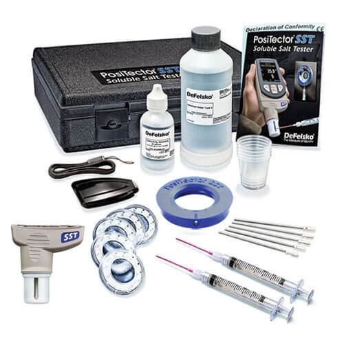 Sada sondy SST pro měření koncentrace rozpustných solí, lepicích komůrek DeFelsko z polyuretanu (25 ks) pro přípravu vzorku, injekčních stříkaček s jehlami pro odběr a 250 ml roztoku standardní...