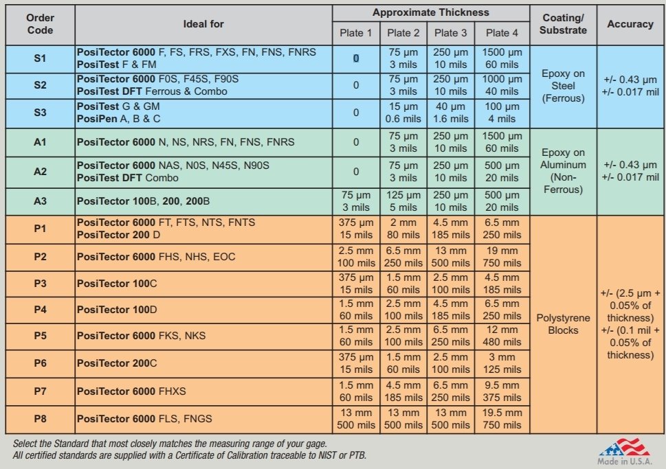 Sady čtyř certifikovaných povlakových neferomagnetických standardů A1, A2, A3 (hliník/epoxy) s přesností ± 0,30 µm. Podklad tvoří hliníková destička s epoxy povlakem o definované tloušťce (viz. tabulka). K sadám je dodáván kalibrační certifikát s návazností na standardy NIST/NPL.