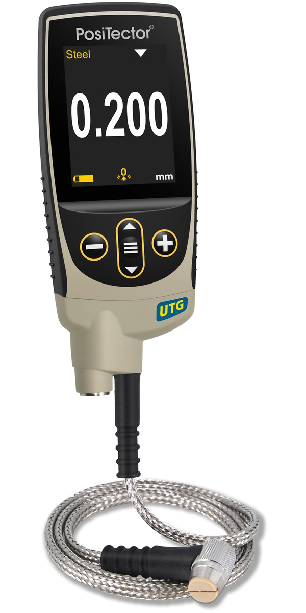 Připojením sondy k tělu přístroje vzniká PosiTector UTG - ultrazvukový tloušťkoměr od společnosti DeFelsko. Tento přístroj měří tloušťku stěn materiálů pomocí ultrazvukové technologie. Je ideální pro měření účinků koroze nebo eroze na nádrže, potrubí nebo jakoukoli strukturu, kde je přístup omezen na jednu stranu. Využít lze předprogramované režimy pro běžné materiály nebo snadno zadejte svůj vlastní. Režim Min Scan - provádějte nepřetržité čtení a zaznamenávejte minimální/maximální tloušťky - ideální pro rychlou inspekci.