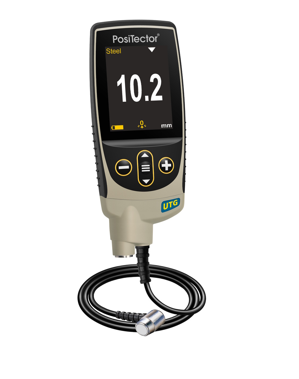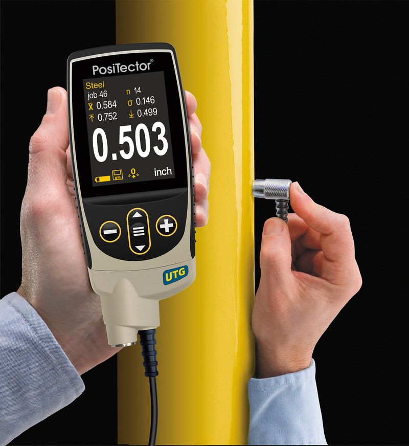 Připojením sondy k tělu přístroje vzniká PosiTector UTG - ultrazvukový tloušťkoměr od společnosti DeFelsko. Tento přístroj měří tloušťku stěn materiálů pomocí ultrazvukové technologie. Je ideální pro měření účinků koroze nebo eroze na nádrže, potrubí nebo jakoukoli strukturu, kde je přístup omezen na jednu stranu. Využít lze předprogramované režimy pro běžné materiály nebo snadno zadejte svůj vlastní. Režim Min Scan - provádějte nepřetržité čtení a zaznamenávejte minimální/maximální tloušťky - ideální pro rychlou inspekci.