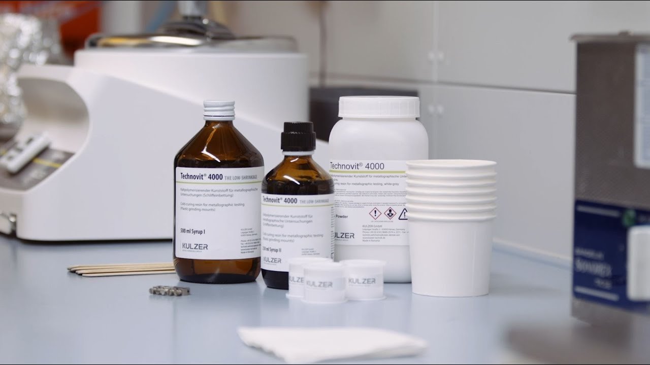 Transparentní hmota pro zalévání materiálových vzorků umožňuje jejich vizuální kontrolu. Technovit 4004 je dvousložková zalévací hmota (prášek : tvrdidlo, poměr míchá