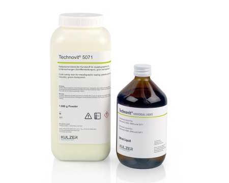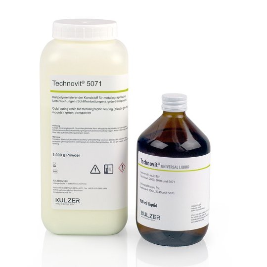 Technovit 5071 je dvousložková zalévací hmota (prášek : tvrdidlo, poměr míchání 2:1 ), kterou je možné po vytvrzení rozpustit a použít pouze samotný vzorek bez stop zalévacích hmot pro další zkoušky.