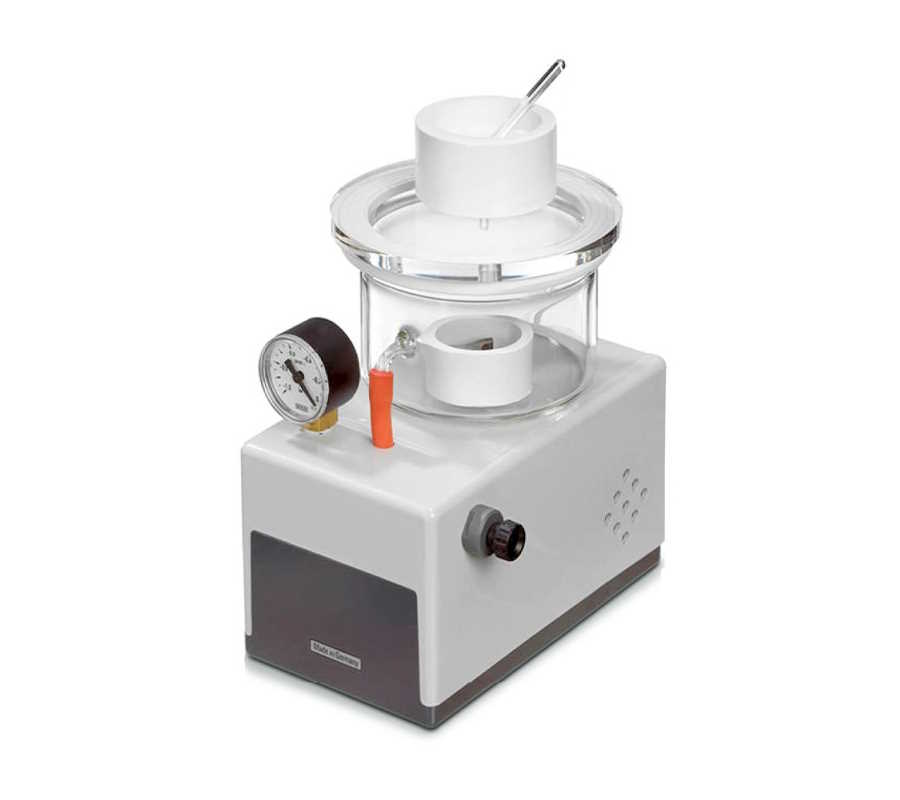 Vakuový set se zařízením pro vakuovou impregnaci. Kompaktní zařízení s vestavěnou vakuovou pumpou a sklěnenou pracovní částí. Vhodné pro zalévání a impregnaci pórézních a komplikovaných kovových, keramických nebo mineralogických vzorků.