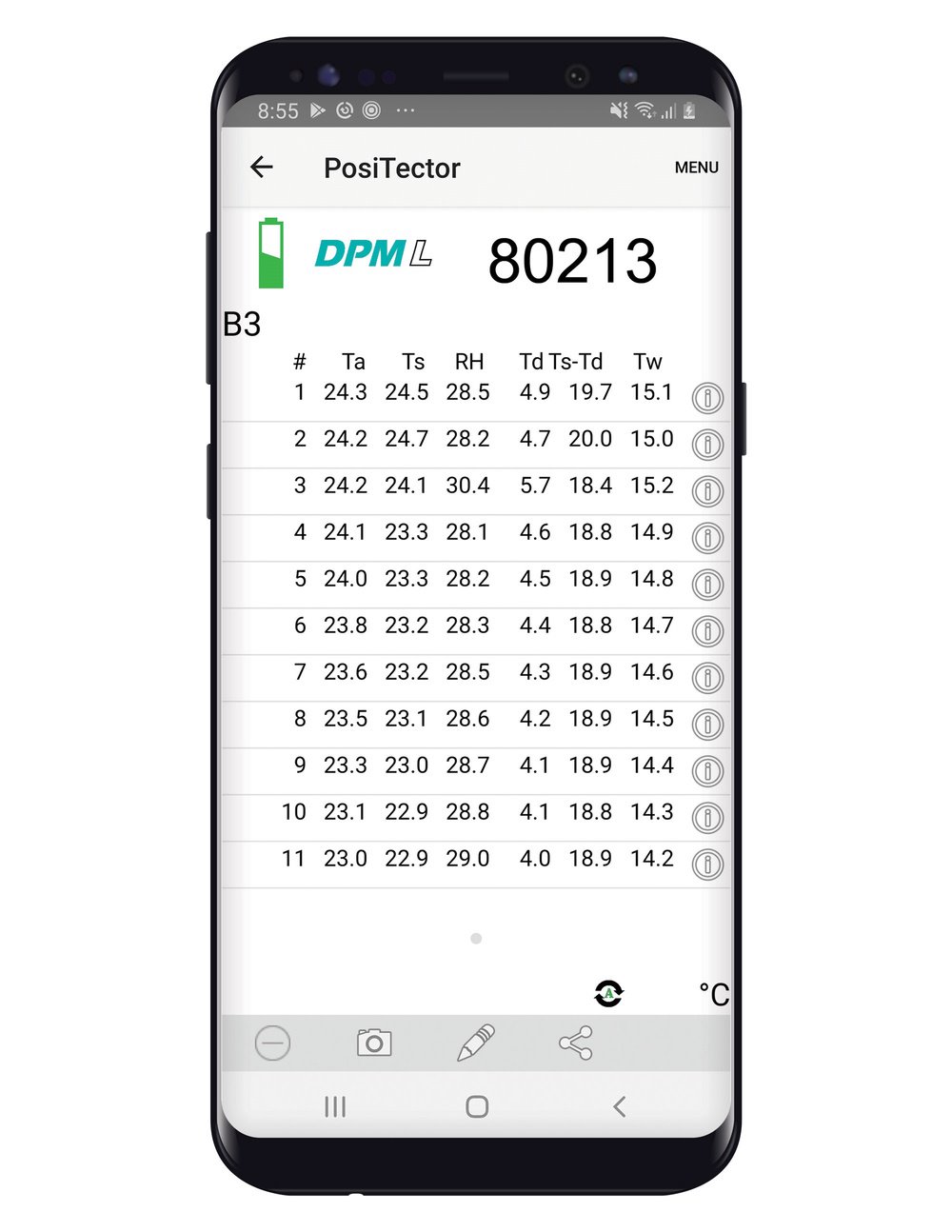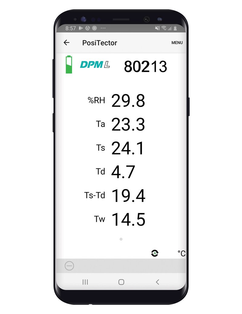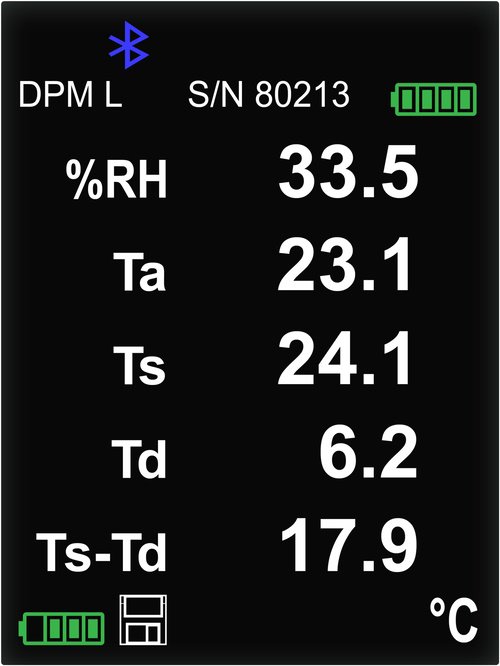 | Měřené klimatické podmínky | relativní vlhkost (%RH), teplota vzduchu, povrchová teplota, rozdíl mezi teplotou povrchu a teplotou rosného bodu (Delta), teplota vhlkého teploměru, teplota rosného bodu |